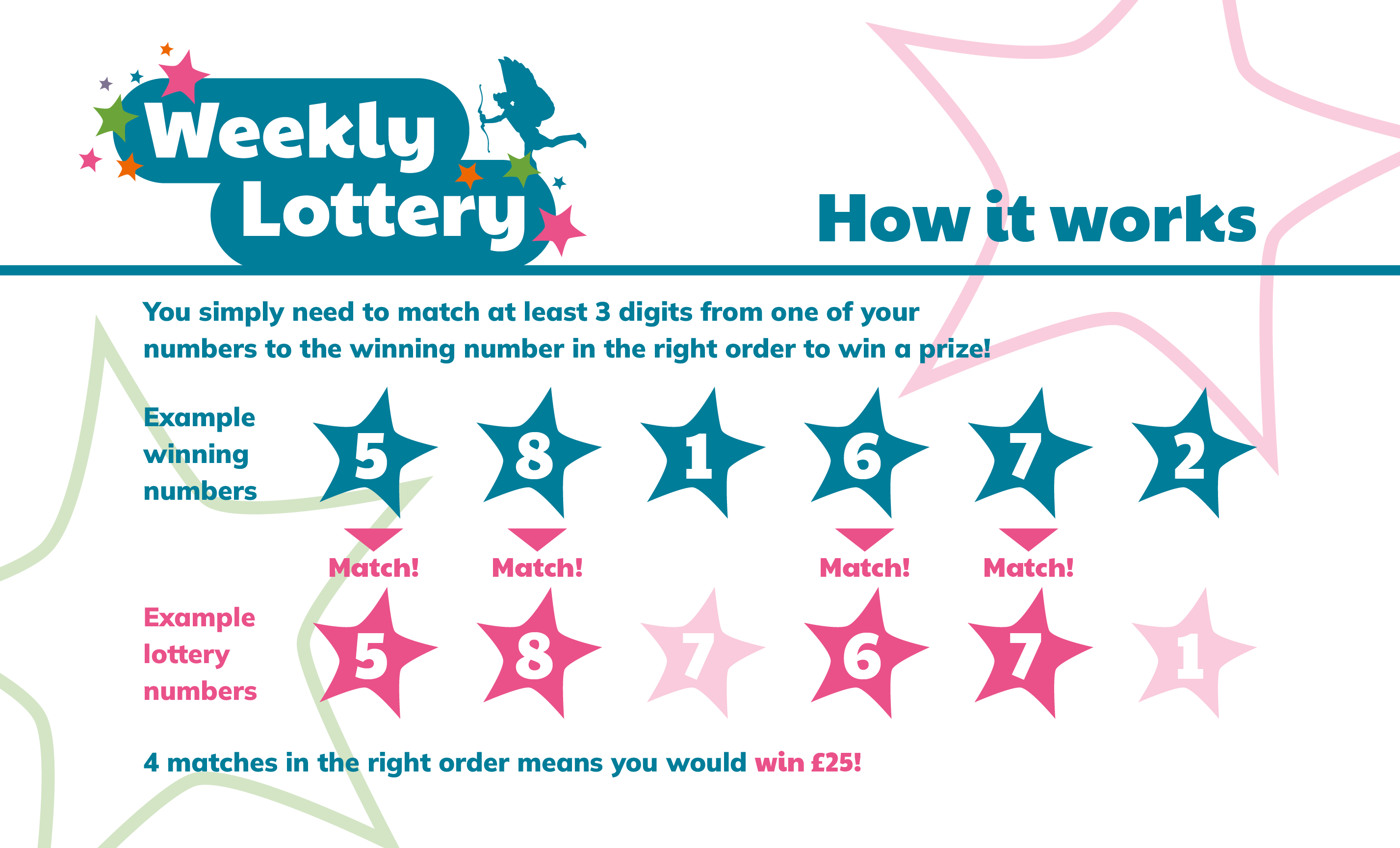 We’ll send you an email confirmation and a letter in the post confirming your entry to our Weekly Lottery, including your lucky six-digit unique lottery number(s).